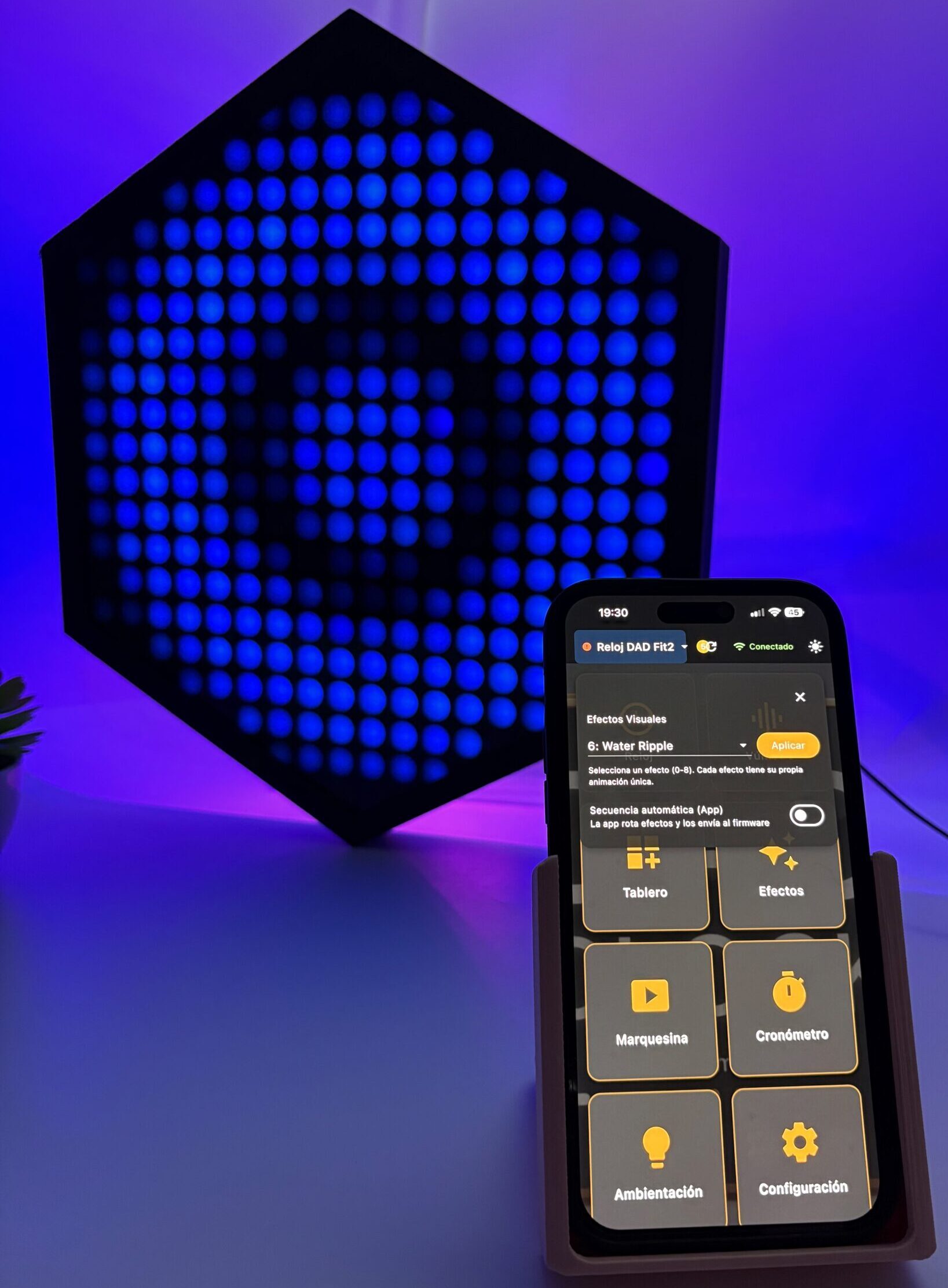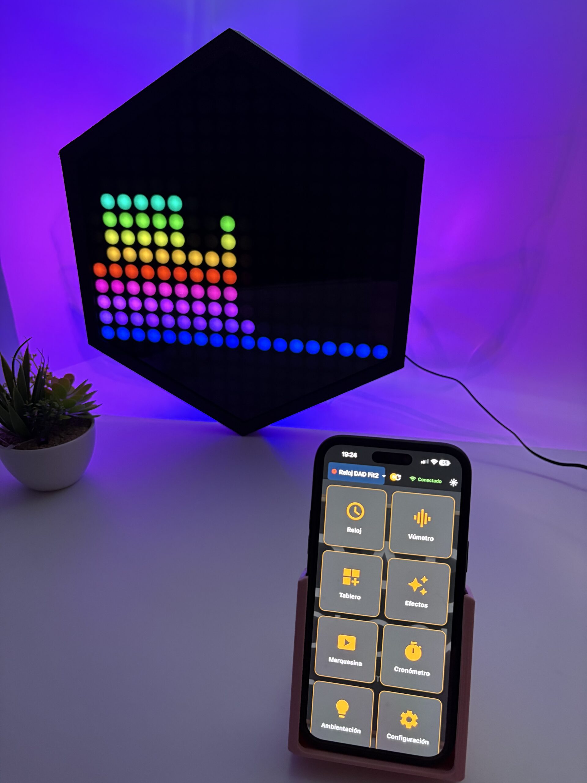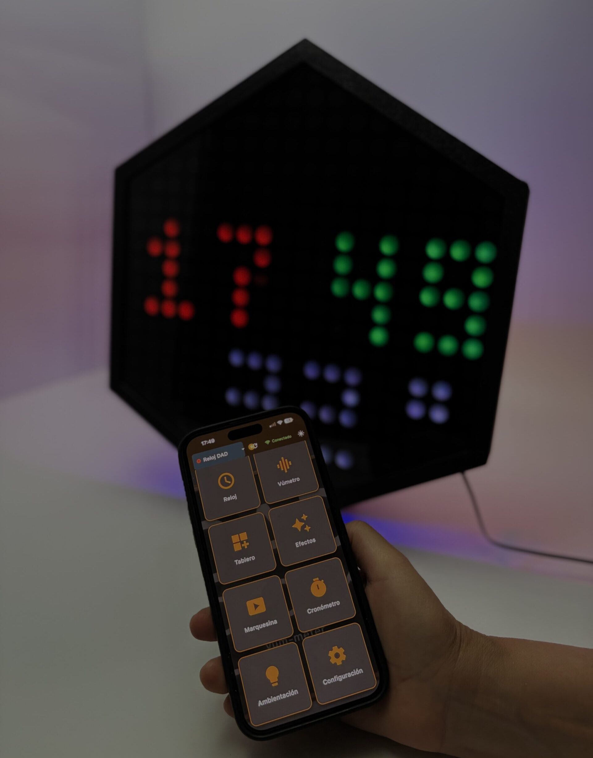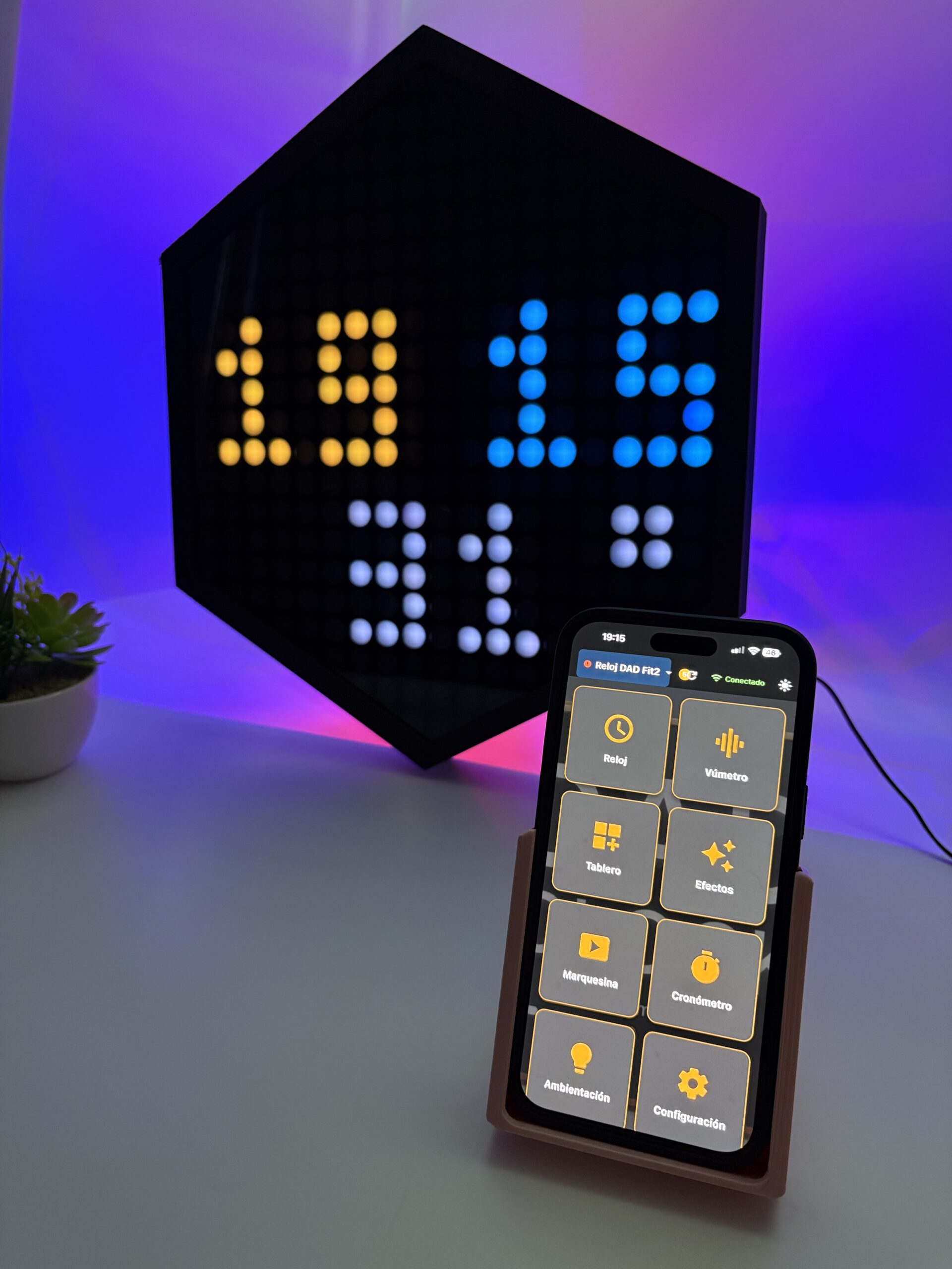 Dad Clock combina diseño premium con tecnología avanzada: análisis espectral en tiempo real, modos visuales dinámicos y control total desde tu móvil.