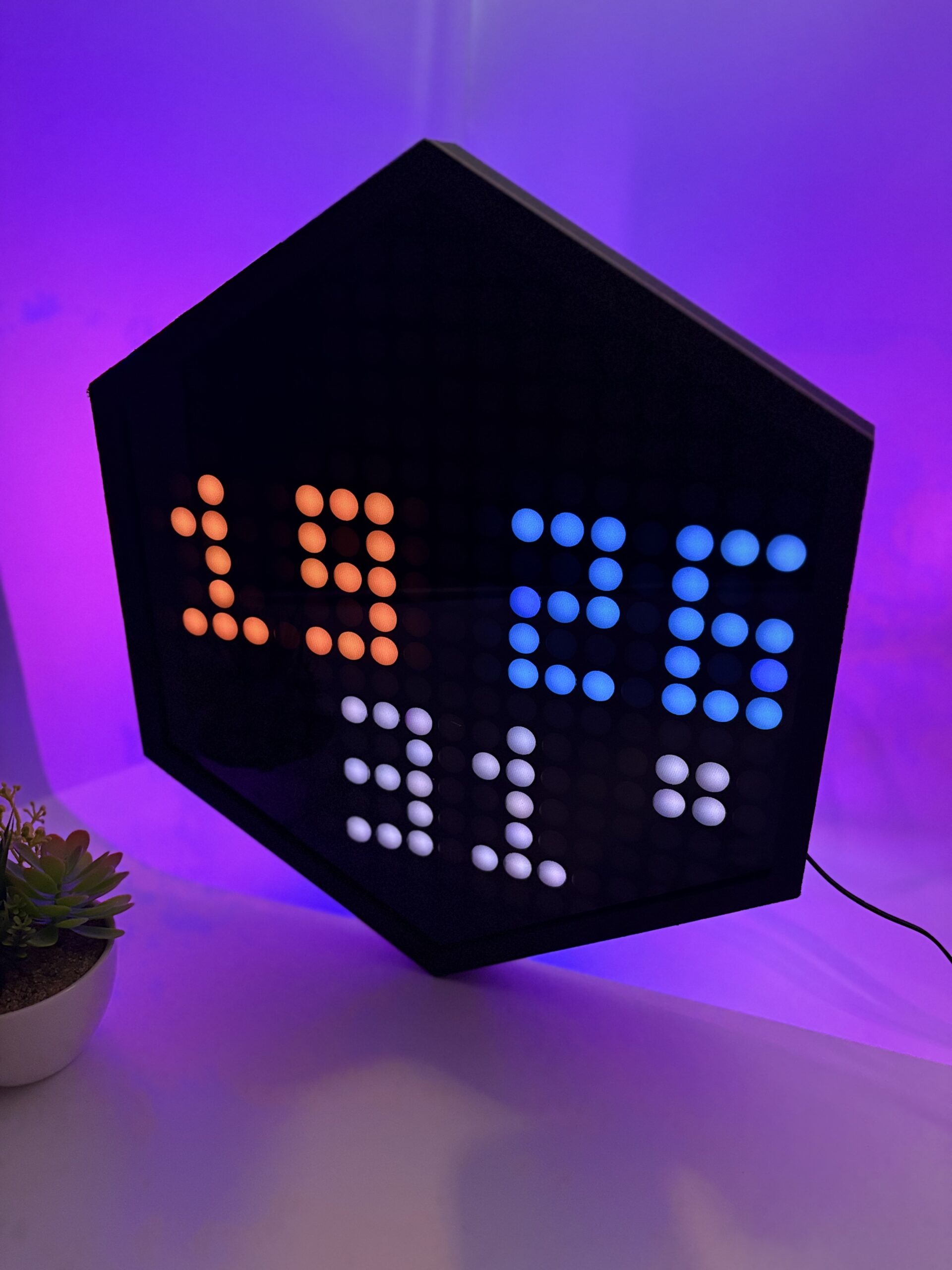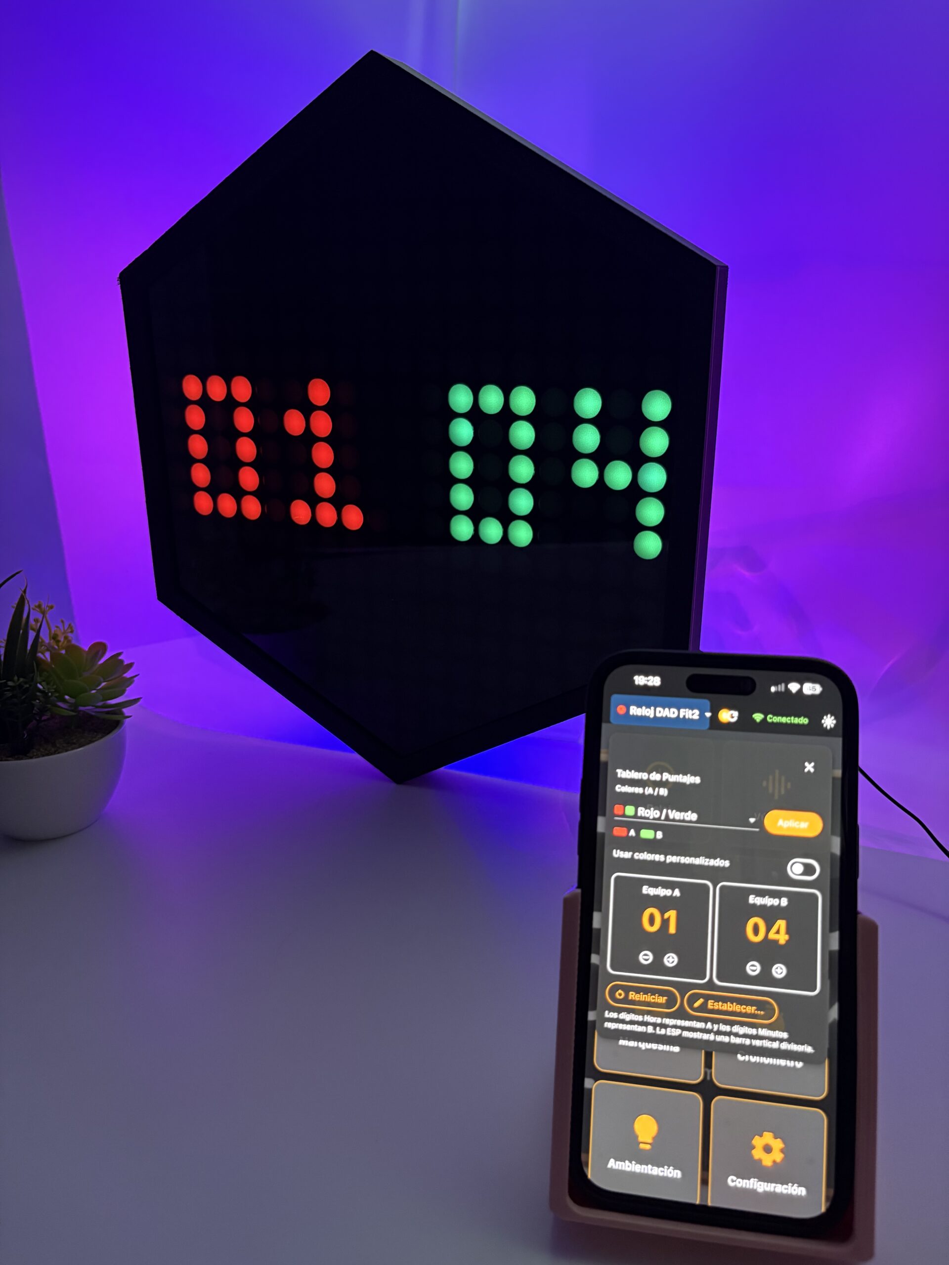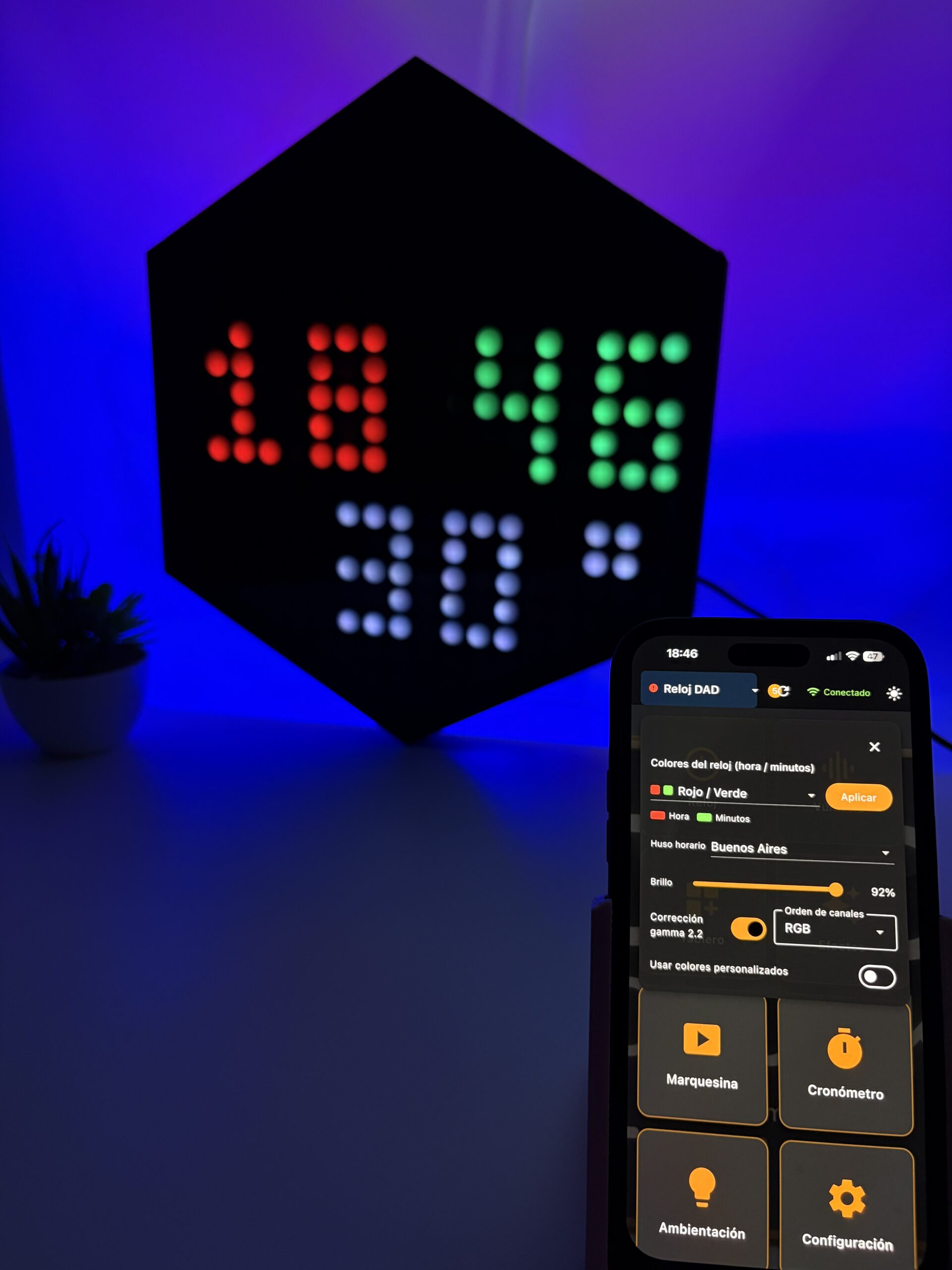 Hora sincronizada por NTP con precisión atómica. Colores personalizables desde la app: elegí entre combinaciones predefinidas o creá la tuya. Formato 12h o 24h.