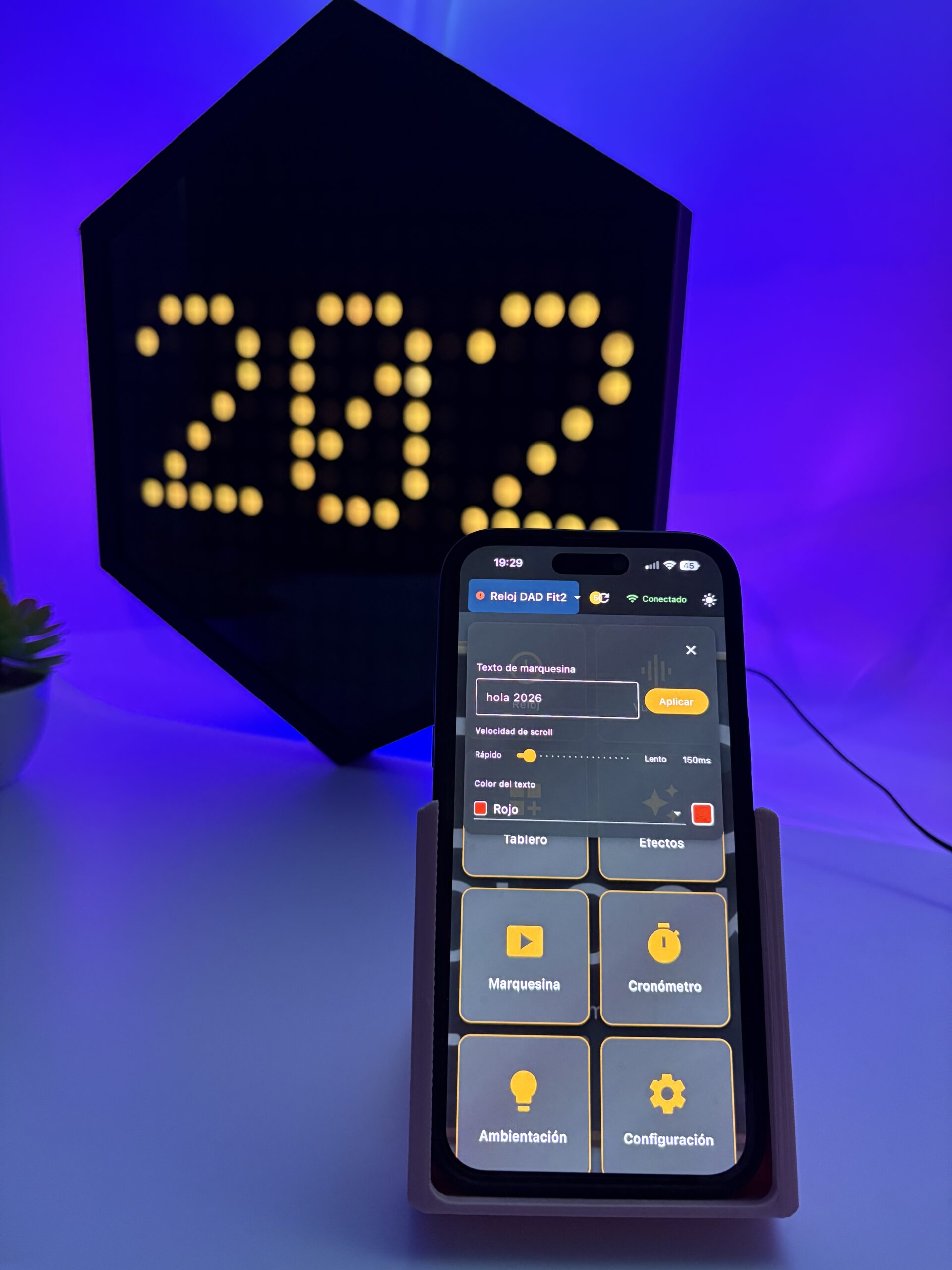 Escribí cualquier mensaje desde la app y miralo desplazarse por tu DAD Clock. Perfecto para eventos, negocios o mensajes personales.