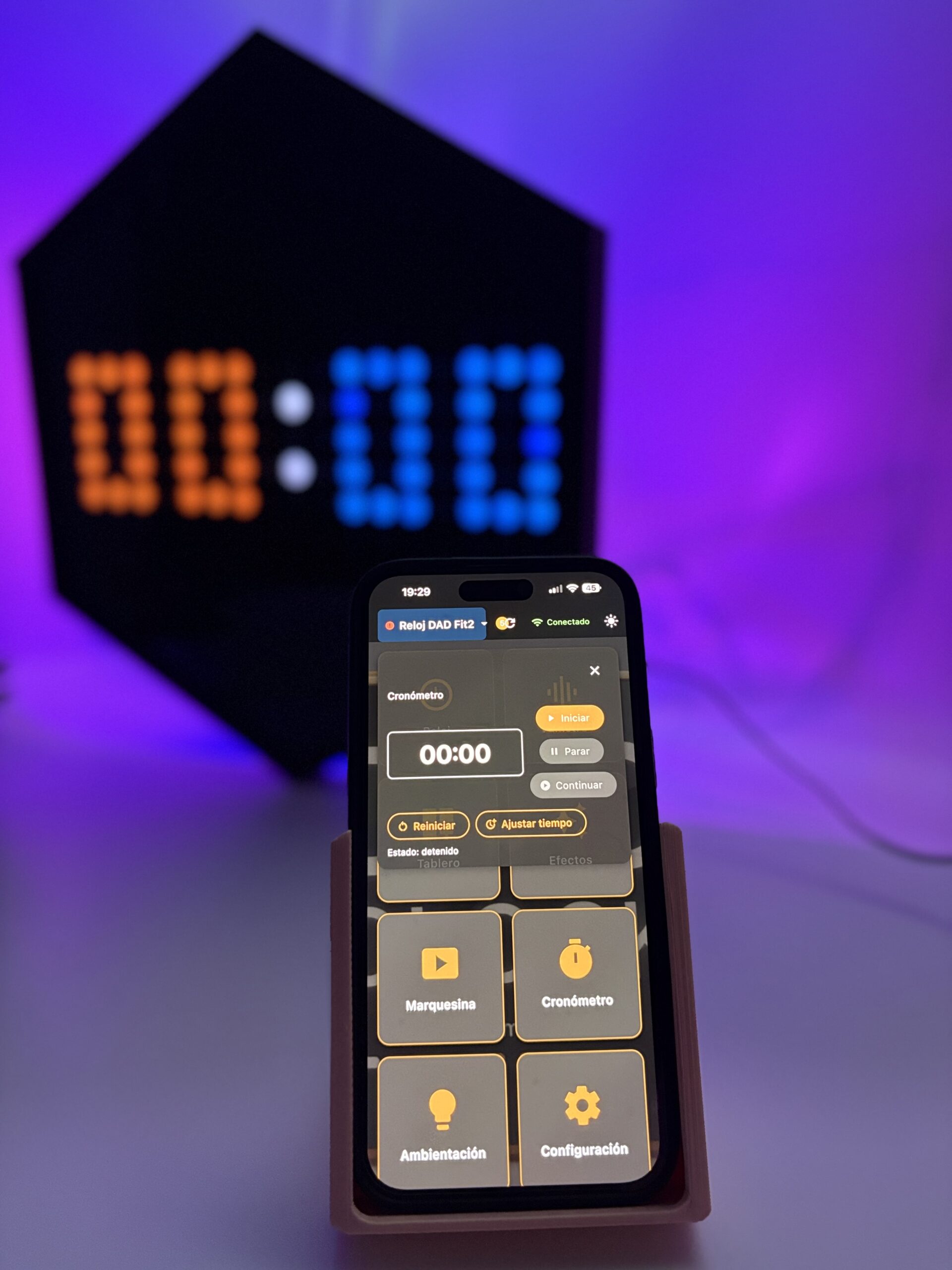 Cronómetro visible de pared, controlable desde la app. Ideal para gimnasios, cocinas, presentaciones y cualquier actividad cronometrada.